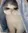 水色の毛布にくるまって顔だけを出している猫のクローズアップ写真。猫はエキゾチックショートヘアのような特徴的な顔立ちで、グレーと白の被毛をしています。少し眉間にしわを寄せたような、不機嫌そうな表情がとても愛らしいです。背景はぼかされており、猫の表情に焦点が当たっています。